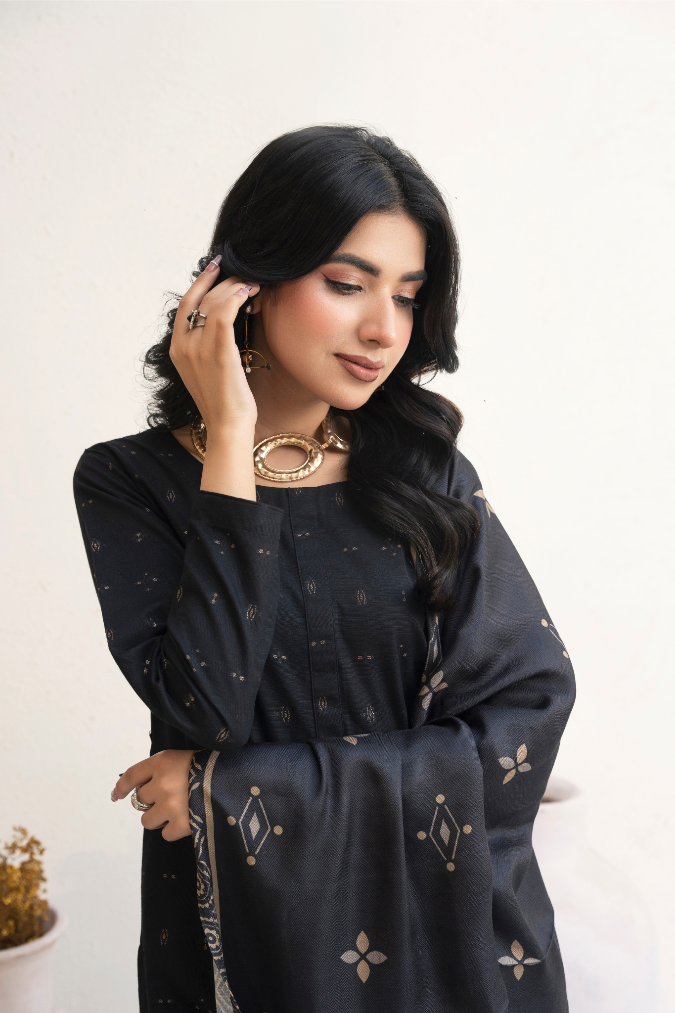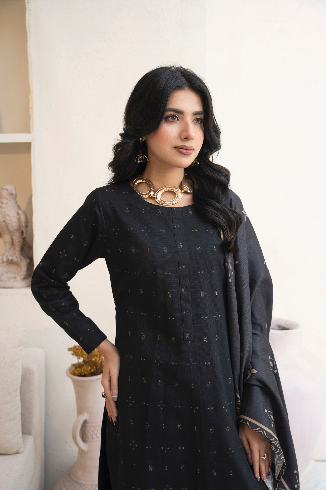 This exquisite Women’s Black Winter Wear Kurta Set from Designer Rack is perfect for daily wear. Crafted from cozy Khaddar fabrics, the 3-piece set includes a long slim-fit Kurta, straight trouser, and wool dupatta. The stitch work technique adds a touch of elegance, making it a must-have for your winter wardrobe.