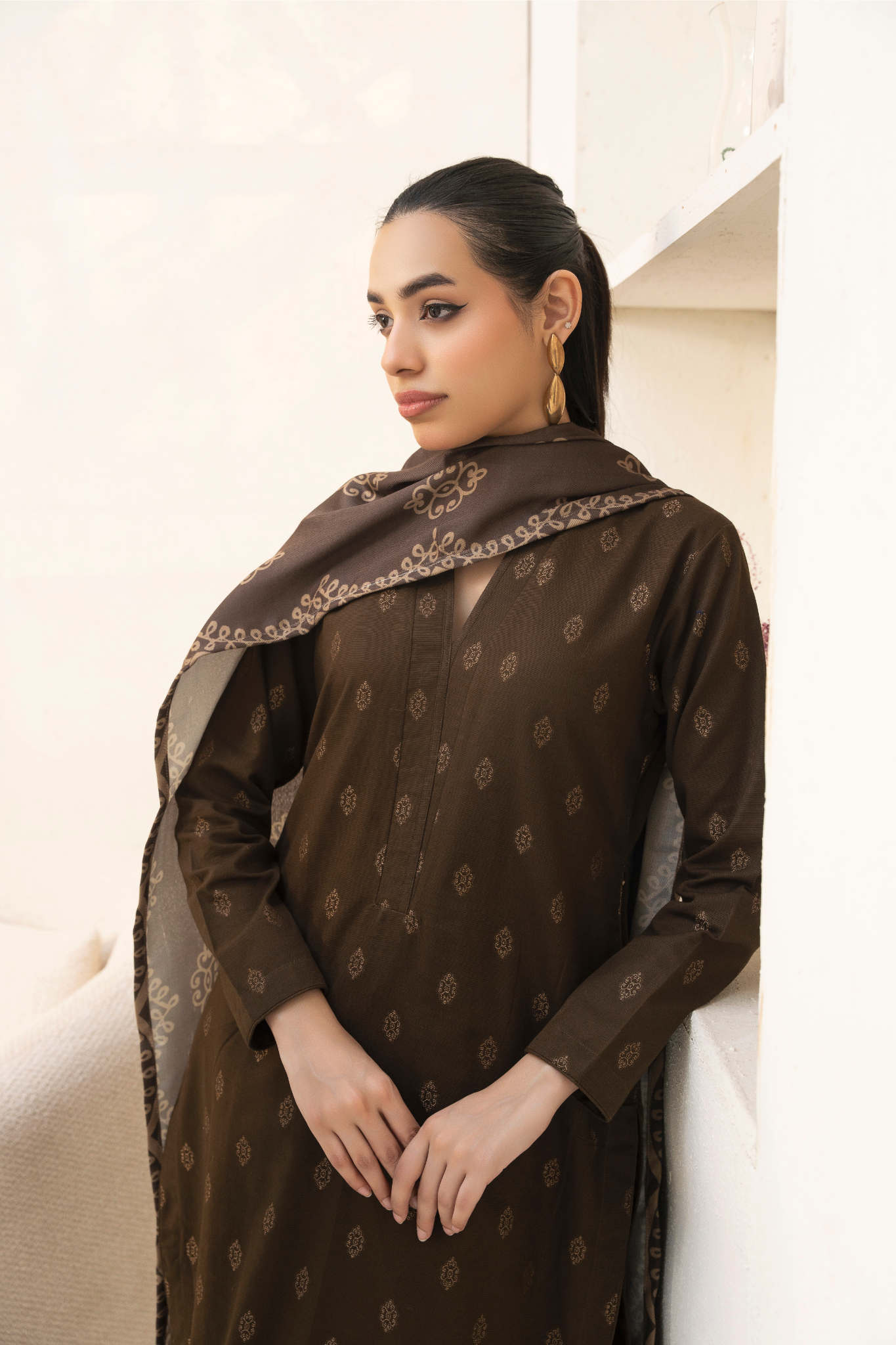 This exquisite women’s 3-piece Kurta Set is a winter wardrobe essential. Crafted from cozy Khaddar fabric, the long Slim-Fit Kurta in Walnut Brown is paired with a Straight Trouser and Wool Dupatta. The Stitch work technique adds a touch of elegance to this daily wear ensemble. Perfect for a chic and stylish winter look. Designer Rack.