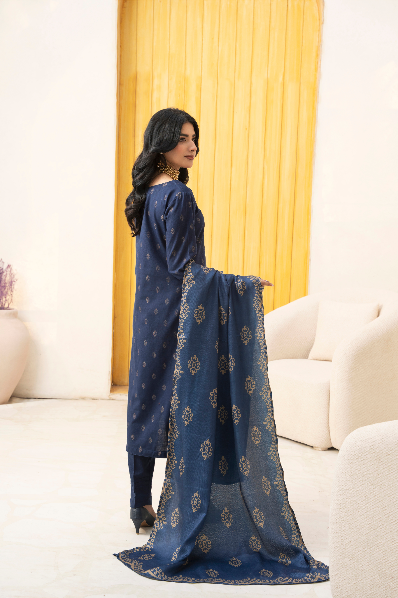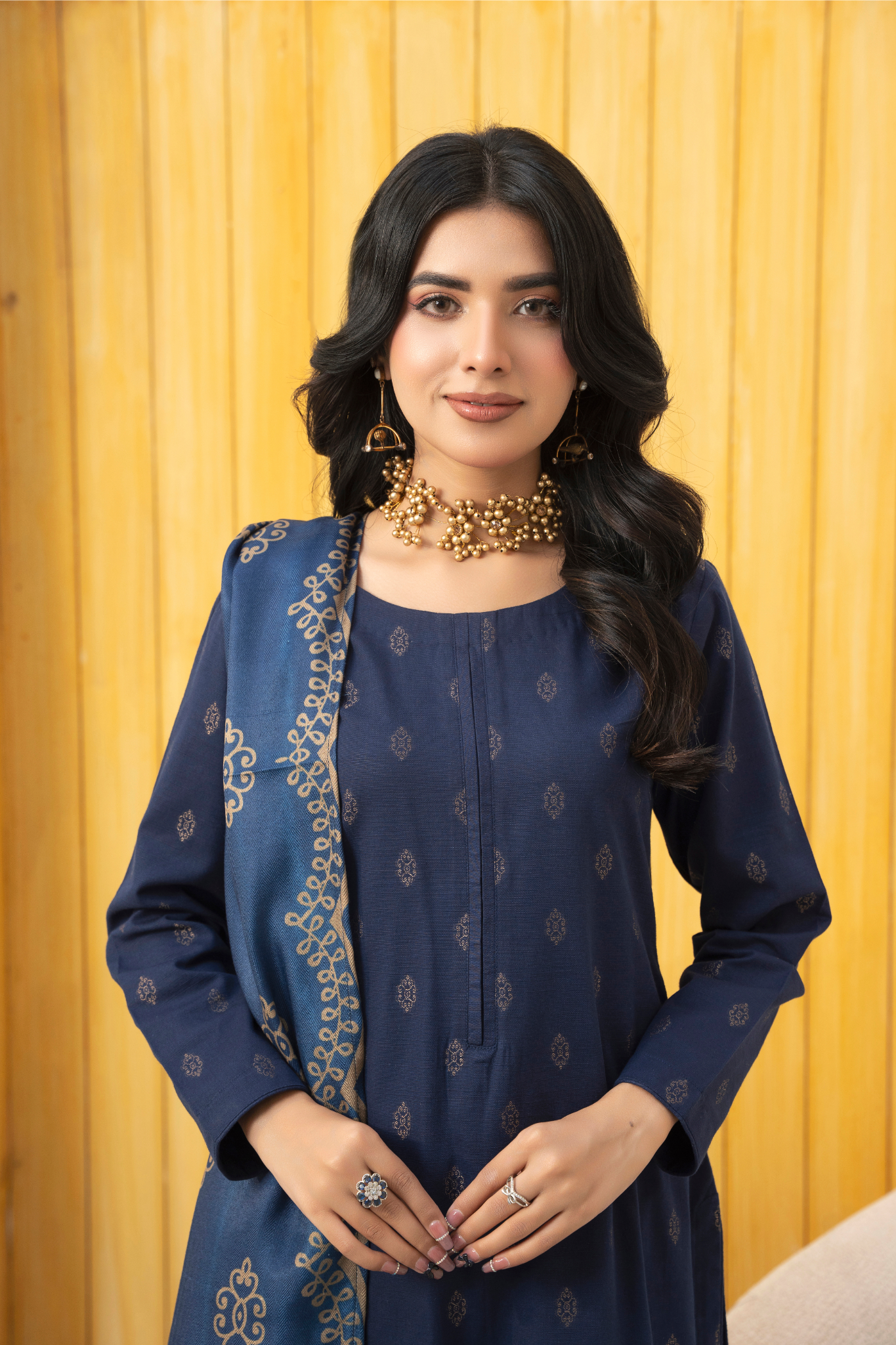 This exquisite women’s kurta set is a must-have for winter wear. Crafted from cozy khaddar fabrics in navy blue, the 3-piece ensemble features a long slim-fit kurta with stitch work, paired with straight trousers. The wool dupatta adds a touch of elegance. Perfect for daily wear, this set from Designer Rack is a blend of comfort and style.