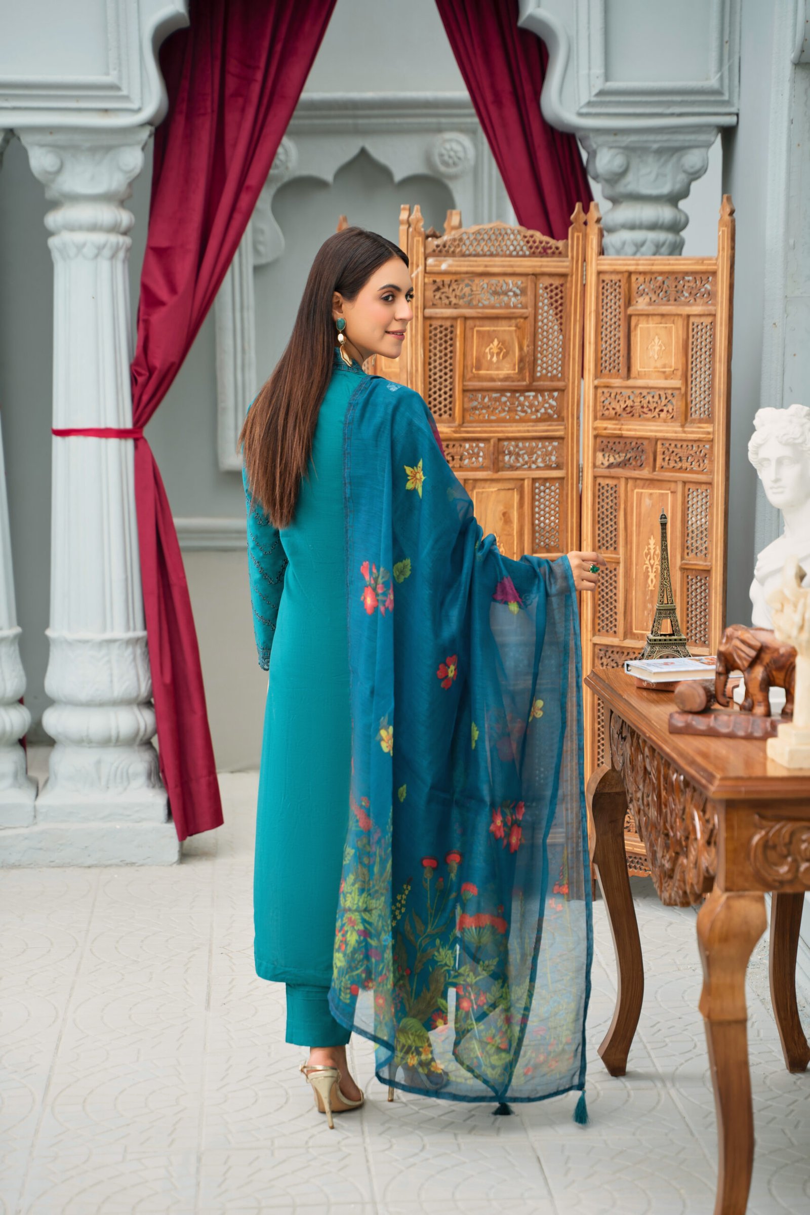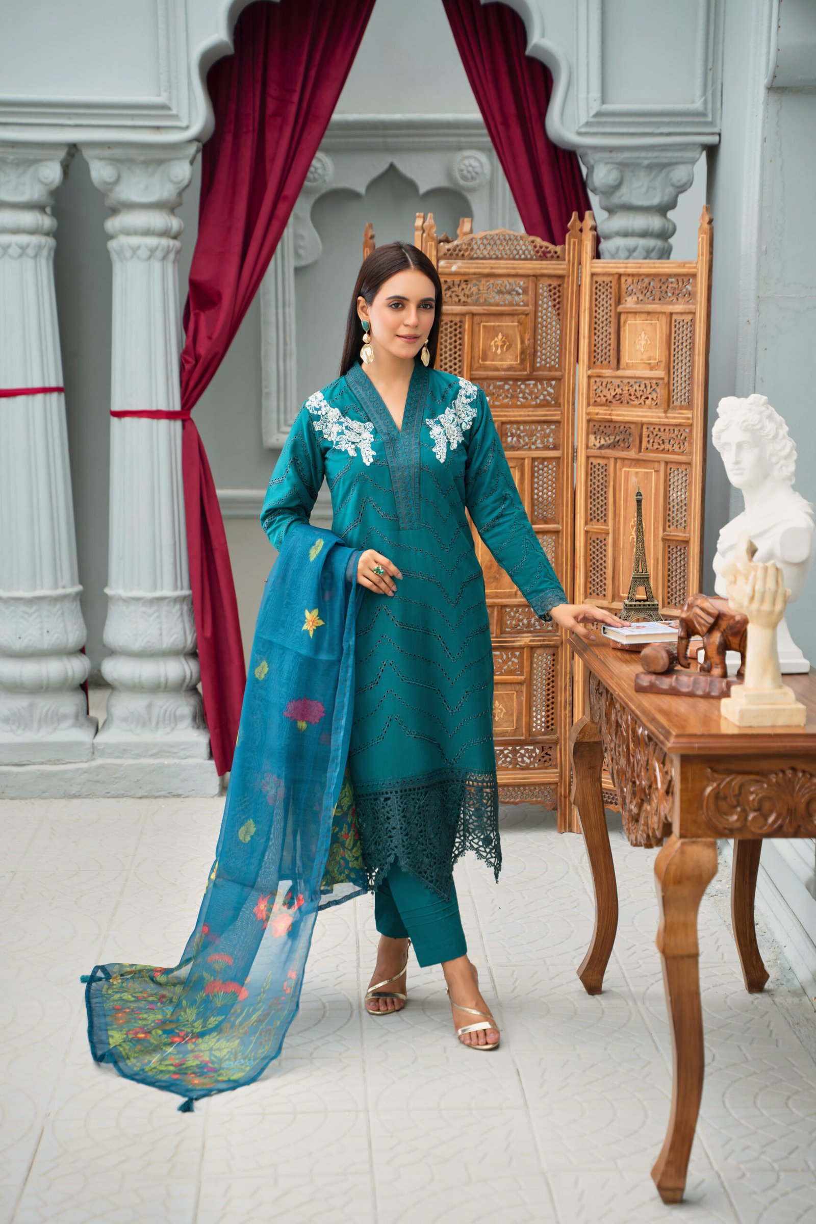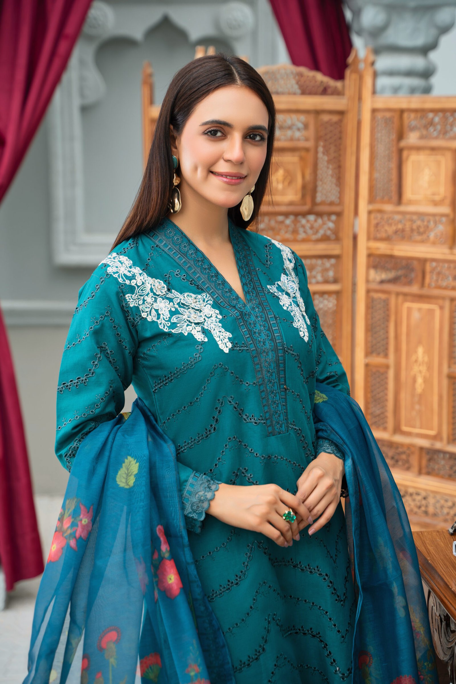 This is an elegant teal embroidered suit that beautifully blends simplicity with sophistication. The shirt features a V-shaped neckline adorned with intricate embroidered detailing along the placket. The highlight of the design is the white floral embroidery on the shoulders, which adds a graceful contrast to the deep teal base. The fabric is further enhanced with a delicate cutwork-style chevron pattern running throughout, giving the outfit a refined and stylish look. The sleeves are finished with embroidered cuffs, while the suit is paired with a coordinating printed dupatta in shades of blue, adorned with floral motifs for a vibrant touch.