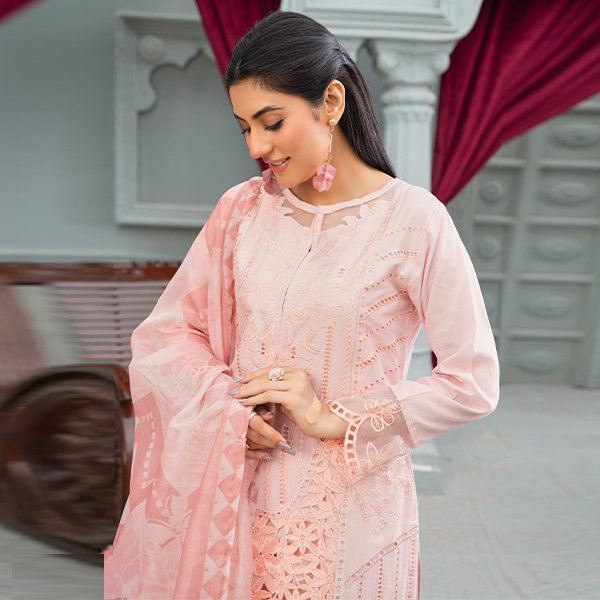 This is a soft pastel pink embroidered suit that exudes grace and femininity. The shirt features a round neckline with a keyhole slit, adorned with delicate tonal embroidery. The front is beautifully decorated with floral and geometric cutwork embroidery, creating a rich and textured look. The sleeves are also detailed with matching embroidery, adding refinement to the design.