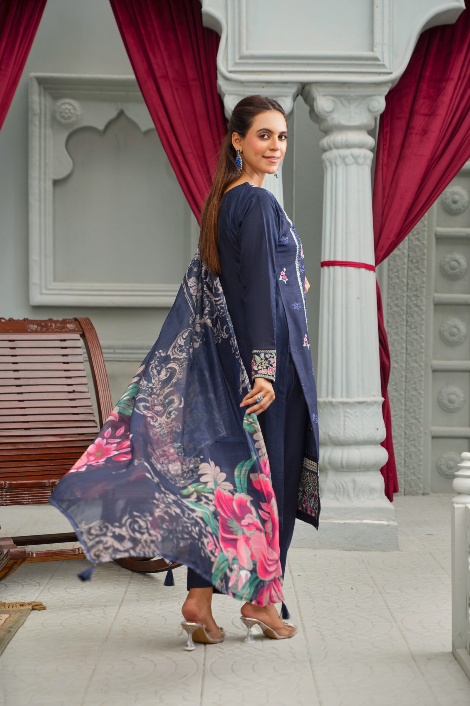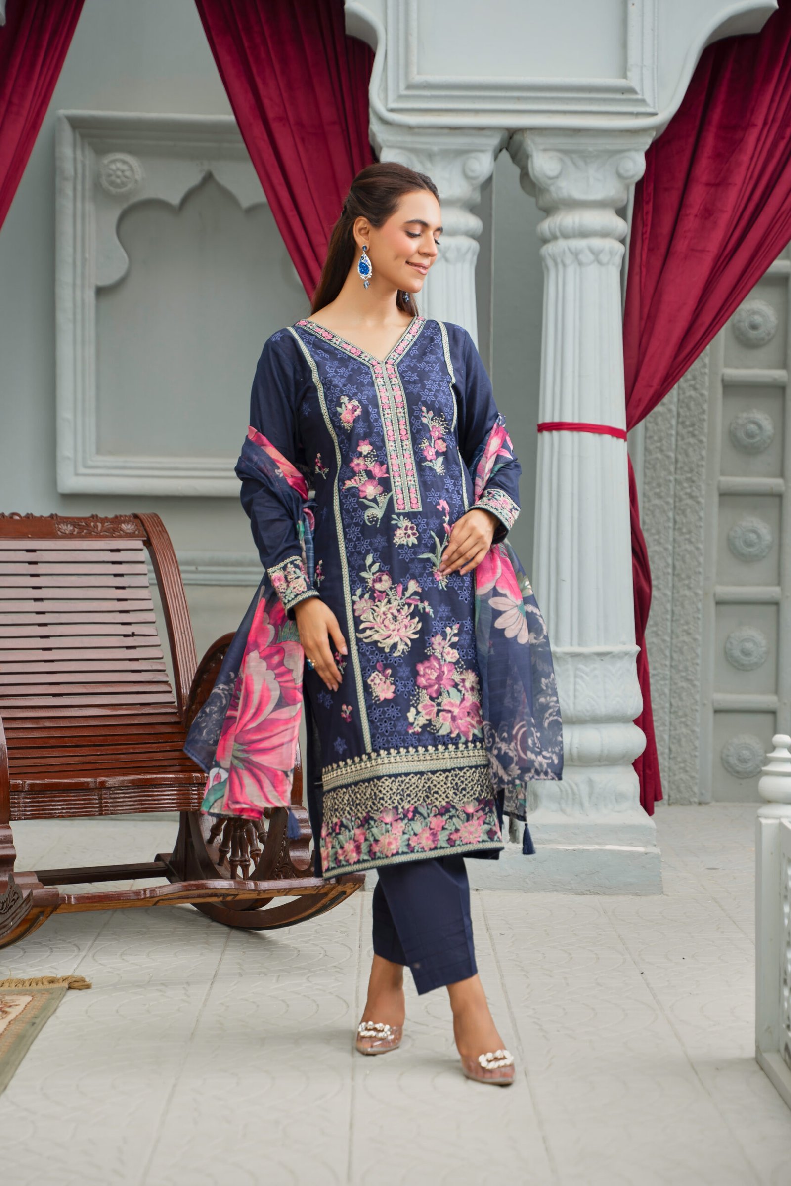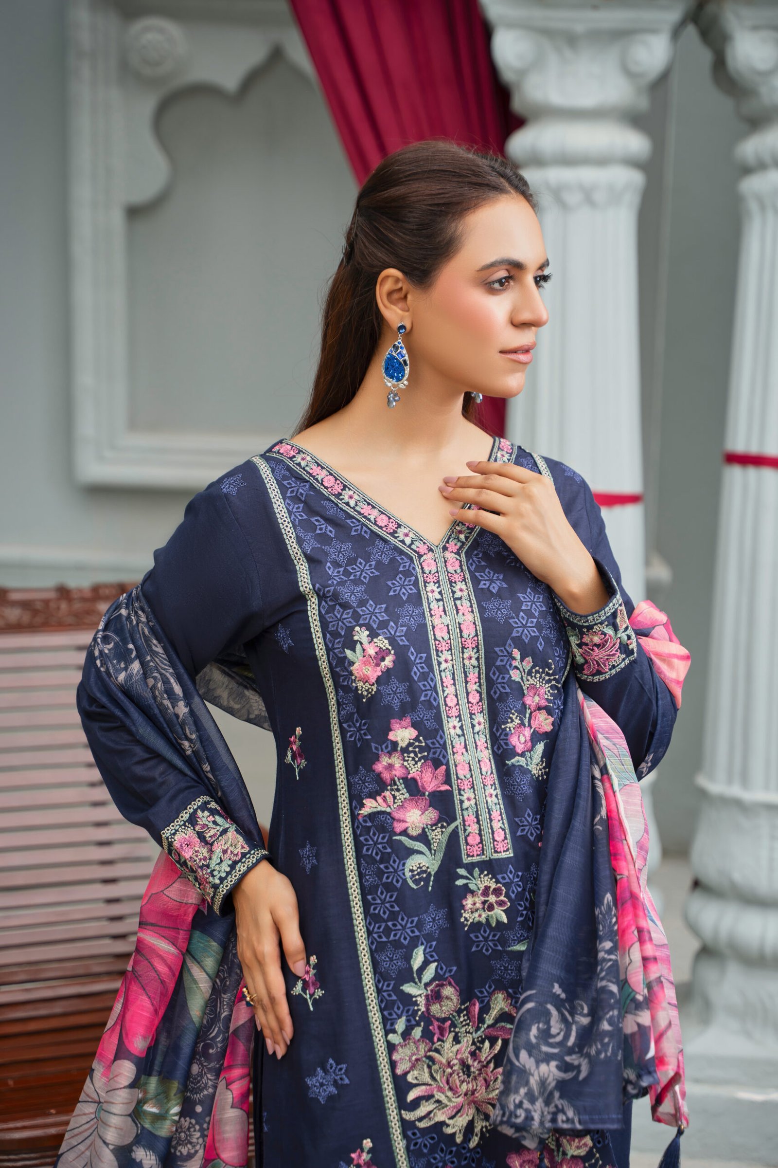 This is a stylish navy blue embroidered cotton fabric suit featuring intricate floral patterns in shades of pink, green, and cream. The neckline is designed in a V-shape with elegant embroidery running along the placket in pink and white tones. The shirt is adorned with all-over floral embroidery combined with delicate geometric motifs, giving it a sophisticated yet festive look. The sleeves are finished with matching embroidered cuffs. The suit is paired with a coordinated dupatta, showcasing bold floral prints in shades of pink, navy, and white, adding a touch of vibrancy to the overall outfit. The fabric appears soft, flowy, and comfortable, making it ideal for both casual and semi-formal wear.