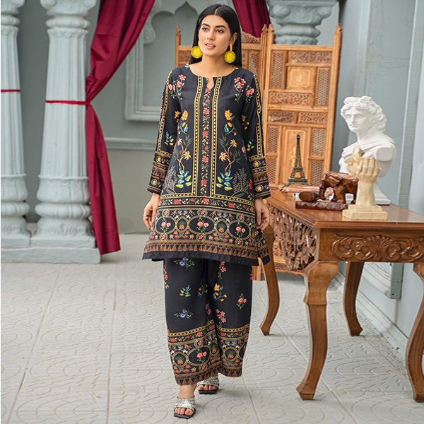 This is a luxurious black silk suit featuring a stunning mix of floral and ornamental prints in vibrant shades. The shirt is designed with intricate border detailing and vertical floral panels, giving it a regal and elongated look. The matching wide-leg trousers carry complementary floral motifs and printed borders, completing the elegant ensemble.