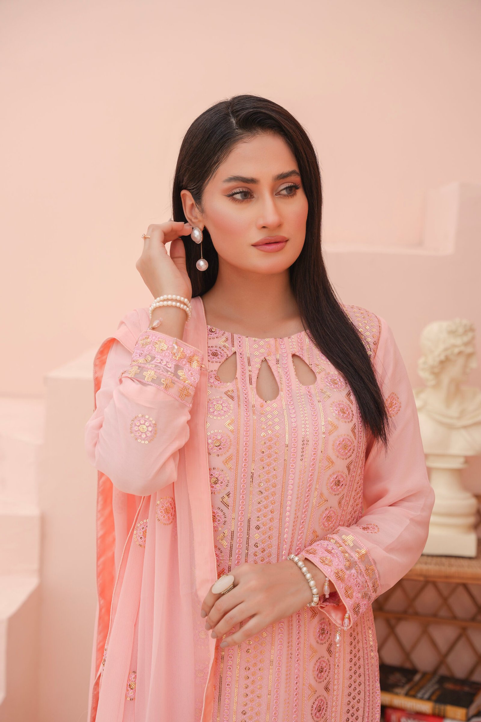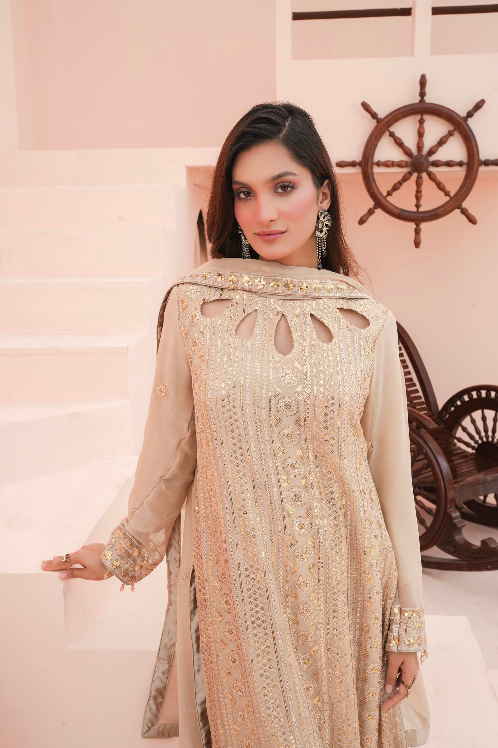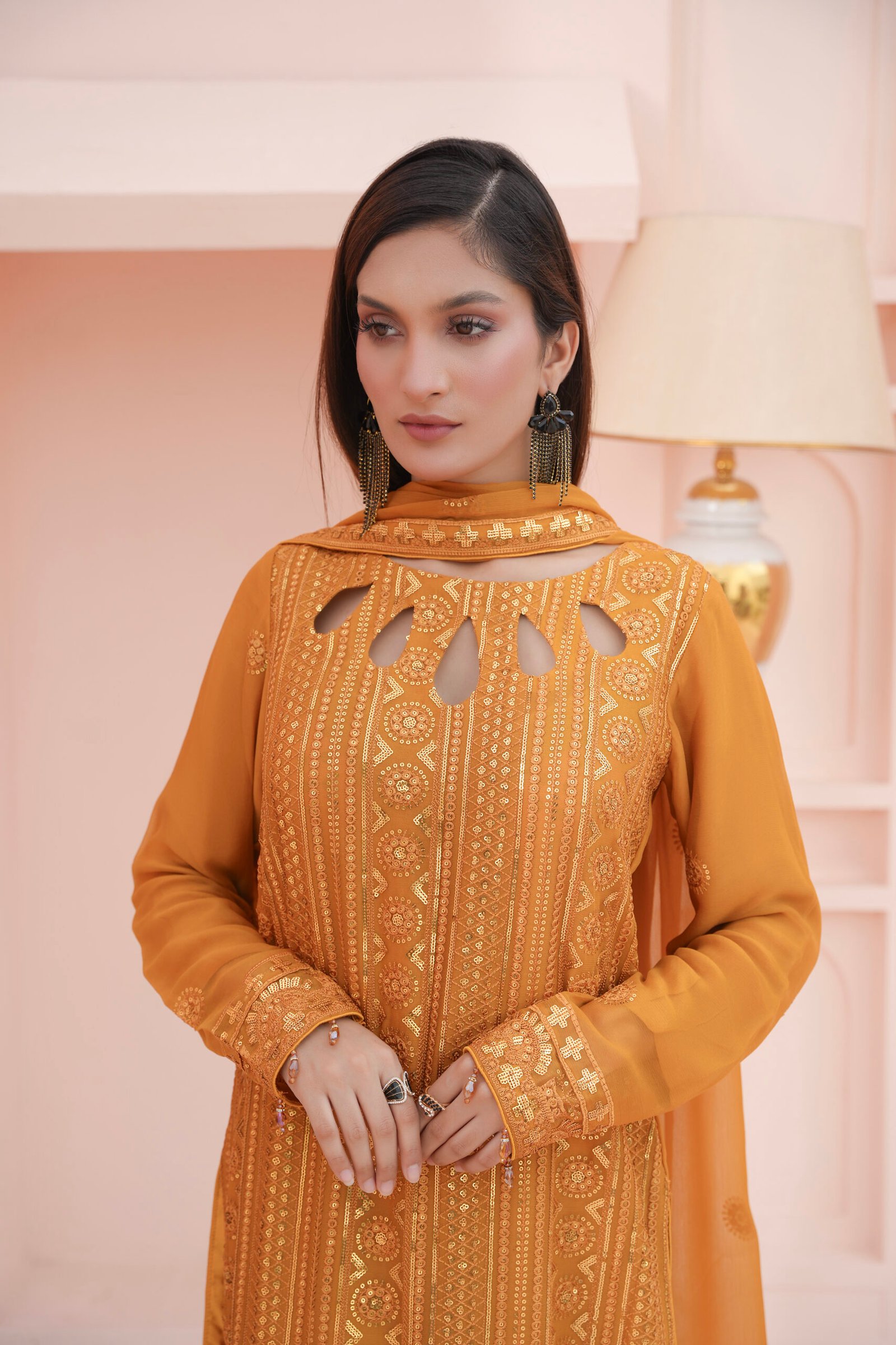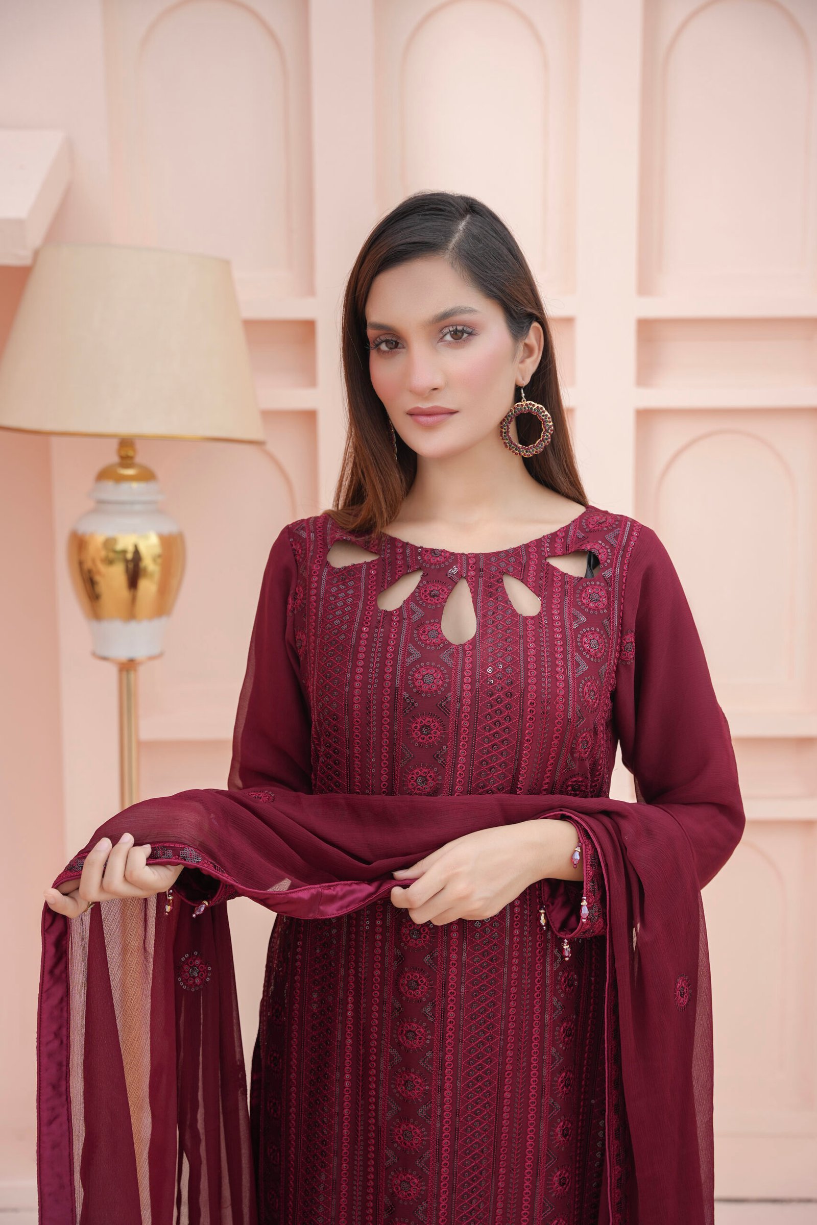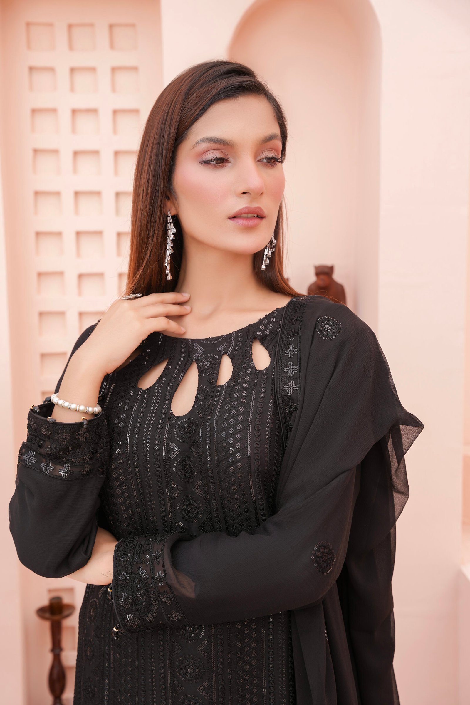 This is an embroidered three-piece suit highlighted with threadwork and sequins. The straight shirt is beautifully detailed with intricate geometric and floral embroidery, enriched with shimmering accents that add elegance. The neckline features stylish teardrop cut-outs, giving it a modern and graceful look. The sleeves and borders are delicately embroidered, perfectly complementing the overall design. Paired with a plain trouser and a chiffon dupatta embellished with matching embroidery, this outfit is ideal for festive occasions, formal events, and celebrations where a touch of sophistication is desired.