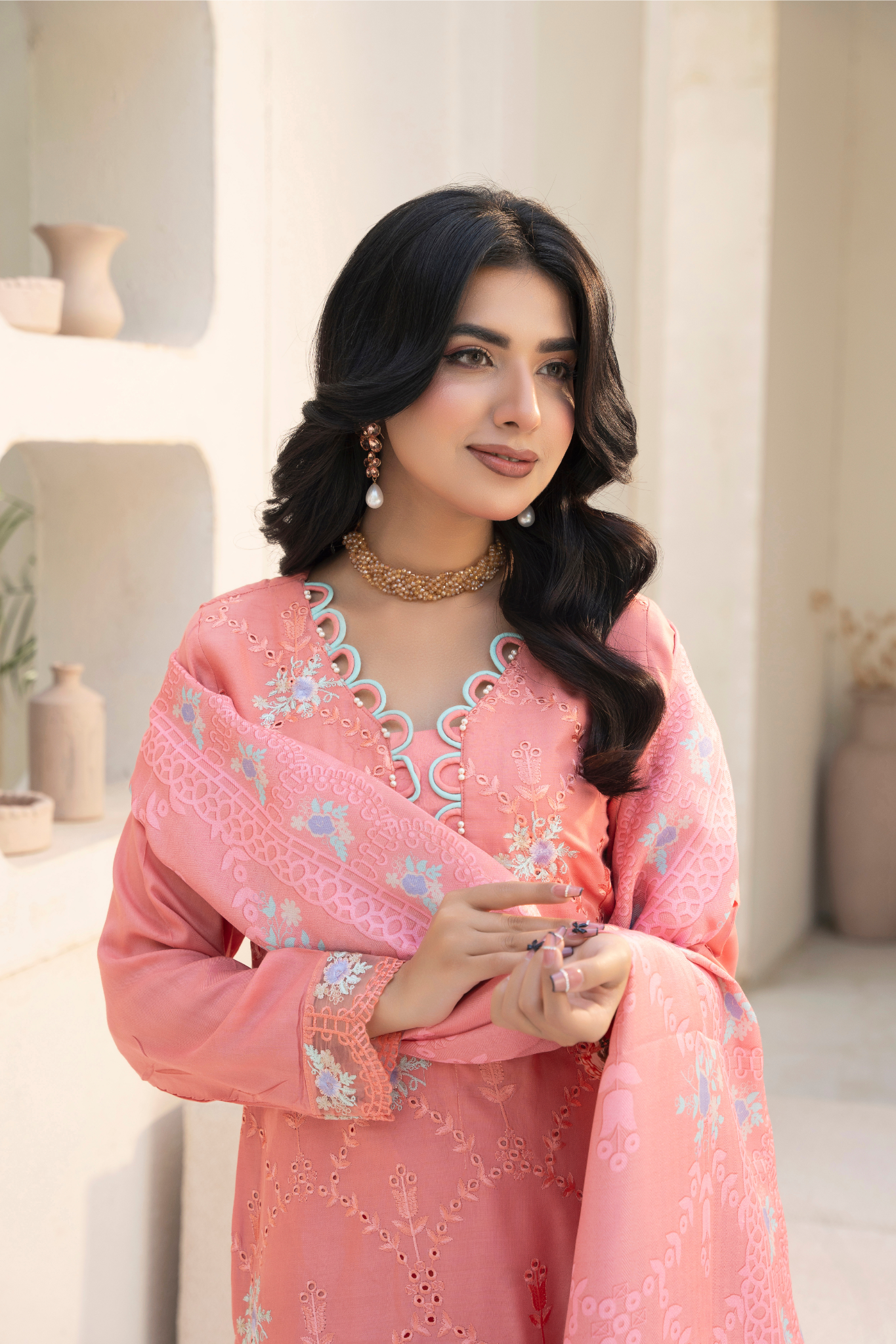 Step into timeless elegance with this stunning three-piece embroidered linen suit in a soft blush pink hue. The outfit features a beautifully detailed embroidered shirt adorned with delicate white and blue floral motifs and intricate cutwork along the hemline and neckline. The scalloped neckline adds a touch of sophistication, perfectly complemented by full sleeves for a graceful look.